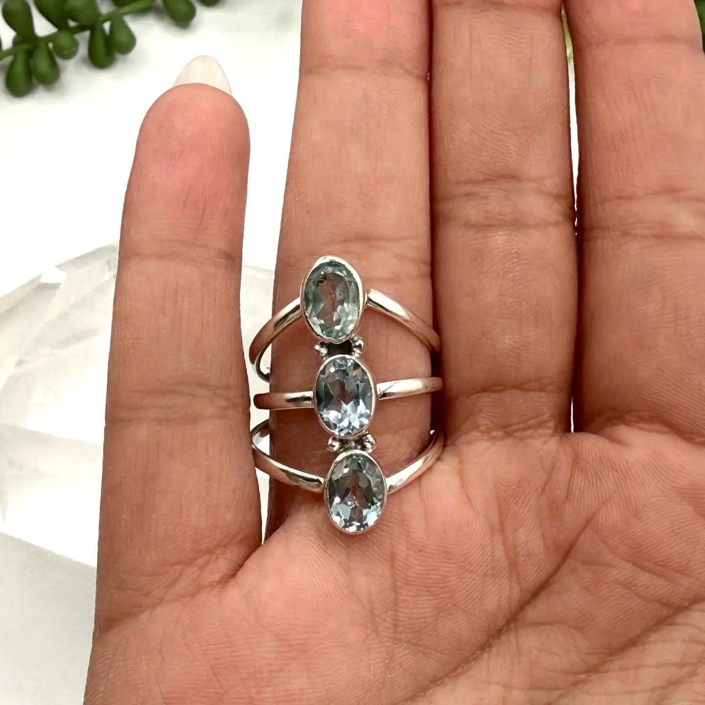 Three beautiful Blue Topaz oval cabochons gracefully flow through this three band sterling silver ring. *All natural semi-precious Blue Topaz gemstones. *Measurement for Center Stone is Approximately 6 x 8mm oval *Sterling Silver/.925 Silver